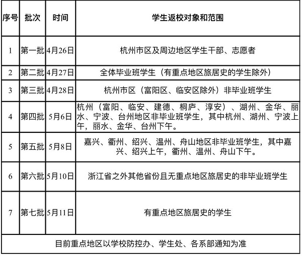 根据《浙江省教育厅新型冠状病毒肺炎疫情防控工作领导小组办公室关于做好高等学校2020年春季学期开学工作的通知》(浙教防控办函[2020]39号),经过钱塘新区督查核验组现场检查同意并报省教育厅备案,按照分类分批、错时错峰的原则,学校自2020年4日26日起安排学生分期分批有序返校,每位学生的具体返校时间和有关要求以学生处、各系通知为准。