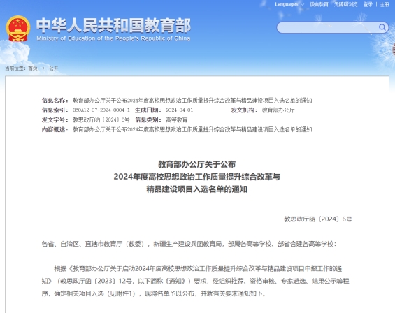 近日,教育部公布了《关于2024高校思想政治工作质量提升综合改革与精品建设项目入选名单的通知》,我校国际贸易学院徐敏丹老师主持申报的《心理赋能计划:聚焦人际关系问题学生育人案例》成功入选“高校学生心理健康教育指导典型案例”。