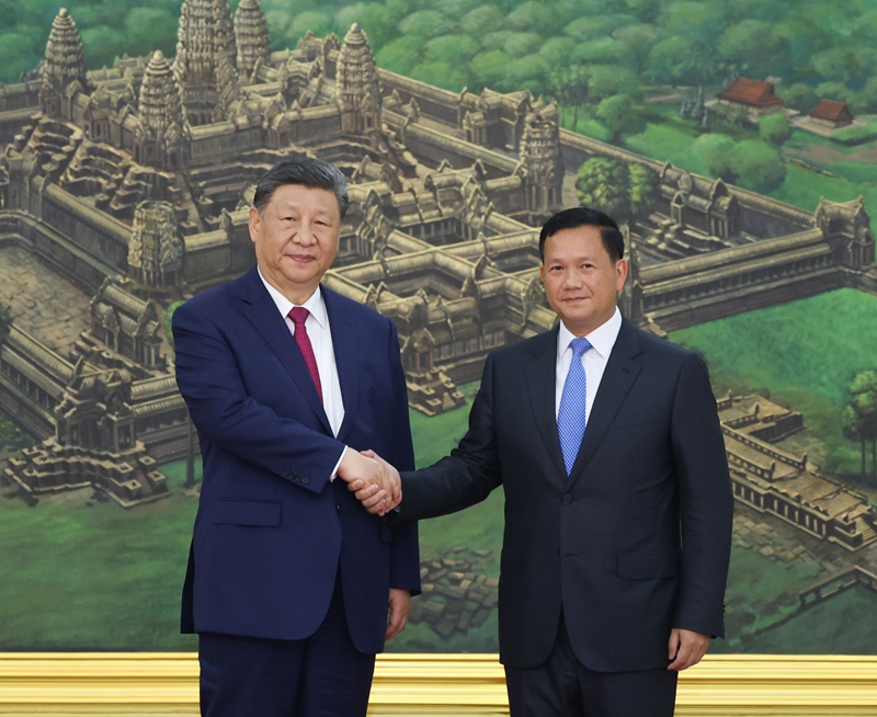 4月17日晚,国家主席习近平同柬埔寨首相洪玛奈在金边和平大厦举行会谈。两国领导人一致同意携手构建新时代全天候中柬命运共同体,宣布2025年为“中柬旅游年”。